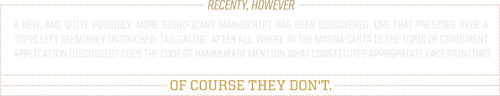 But, like the games we love so much, tailgating is constantly evolving. For that reason, the Tailgating Constitution is a living document, representative of the smorgasbord of unique fans it serves. If you, the reader/fan, feel as if you are not being adequately represented, take a stand. Let us know what you would like to see amended. If your proposal is ratified by three fifths of the governing body, it will be passed on to our scribes to be written in.